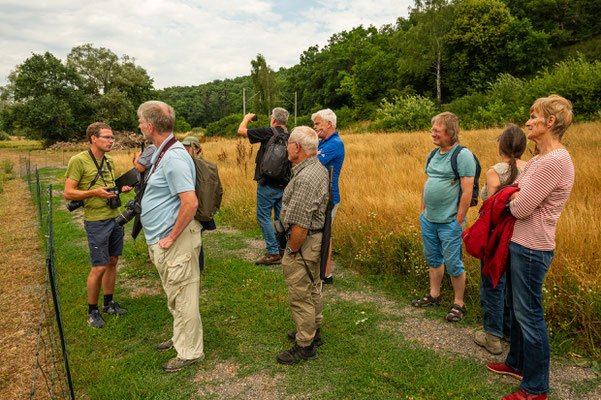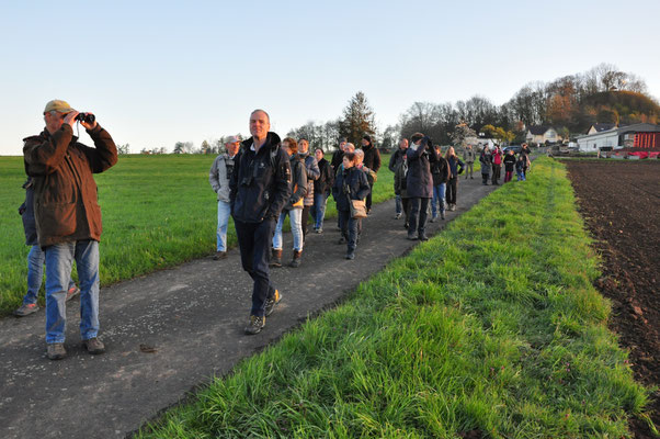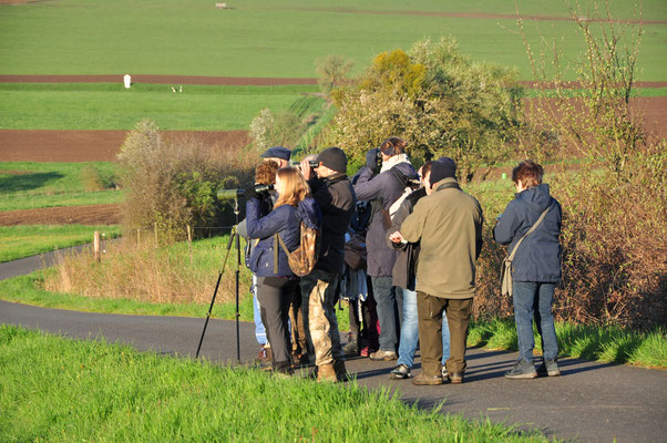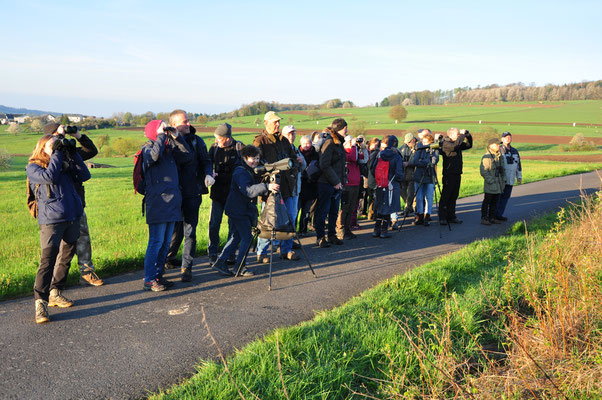 Der NABU Hundsangen zeigte auf dieser erlebnisreichen Exkursion die rufenden Dorf-, Feld- und Waldvögel von den Tauben bis zu den leider immer weniger werdenden Schwalben und Feldsperlingen. Die morgendliche Stimmenvielfalt galt den Grasmücken, Bachstelzen und Grünfinken. Auffallend waren hier die vielen anzutreffenden Ringeltauben und Hausrotschwänze, die auf manch einem Hausdach gurrten oder ihr Liedchen sangen. Nach Verlassen des Treffpunktes, wo Marcel Weidenfeller vom NABU Hundsangen die Teilnehmer*innen und den Referenten begrüßte, ging es in das Feldgebiet unterhalb des Dorfes. Dort konnte mit viel Glück der Vogel des Jahres 2023, ein singendes Braunkehlchen, entdeckt werden. Auf dem weiteren Verlauf des Rundganges durch das Dorf und auf eine Basaltkuppe, dem Burgberg, wurden viele weitere Arten wie Rotkehlchen, Grünspecht, Sperber, Kolkrabe, Mehlschwalbe und der seltene Gartenrotschwanz gehört und beobachtet. Auch das phantastische Wetter sorgte dafür, dass sich viele Vogelarten zeigten und ihre Lieder zum Besten gaben. So durften am Ende der Wanderung die Teilnehmenden auch noch einem spektakulären Vogelzug beiwohnen, als sich knapp 50 Rotmilane vor ihren Augen im Himmel „hochschraubten“. Ein Exkursionsteilnehmer faste das erlebte in einem Satz zusammen: „ Das ist ja hier wie ein Vogelzug bei Gibraltar“