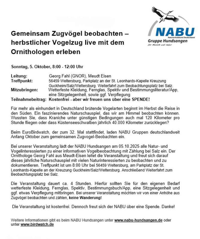 Während der Veranstaltungen können Fotos im Auftrage des NABU Hundsangen erstellt werden, diese sind für die Vereinsarbeit wichtig und finden auf der Homepage, in der Presse oder in Werbematerial Verwendung. Mit der Teilnahme an unseren Veranstaltungen erklären sie ausdrücklich ihr Einverständnis.